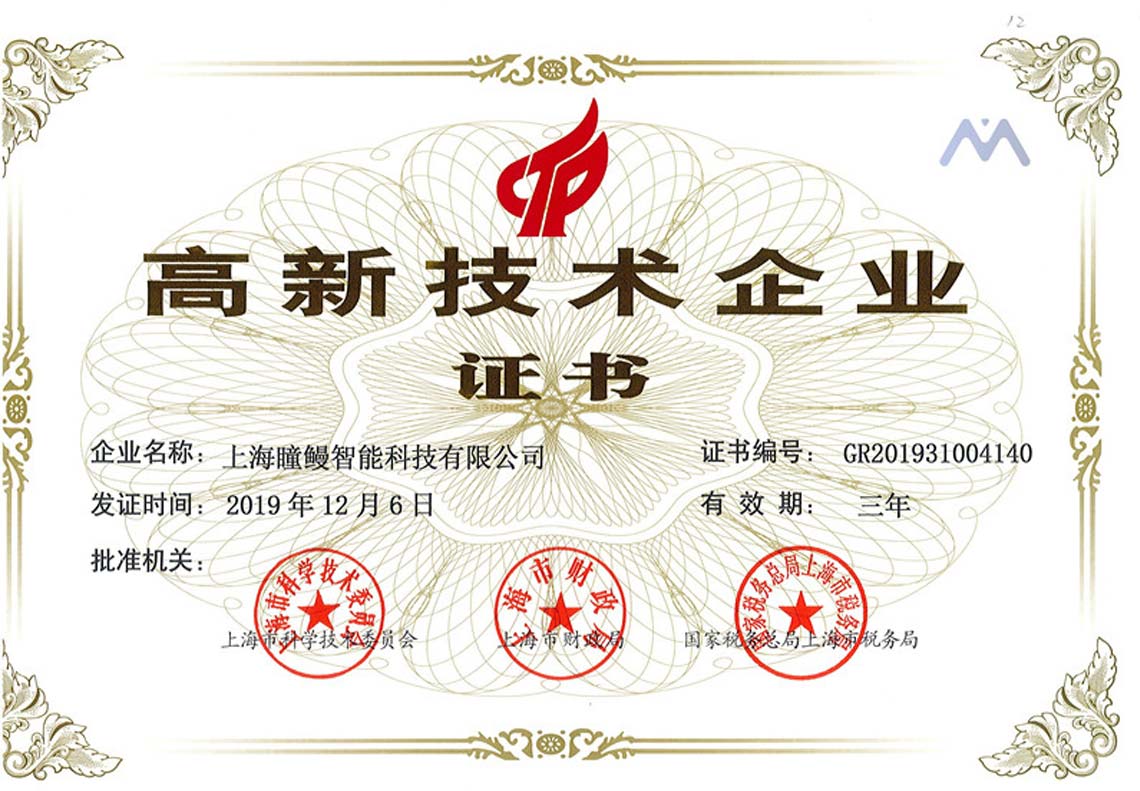Read More >祝賀“瞳鰻智能”順利收獲由上海市科學(xué)技術(shù)委員會、上海市財政局、國家稅務(wù)總局上海市稅務(wù)局聯(lián)合頒發(fā)的國家“高新技術(shù)企業(yè)”證書。